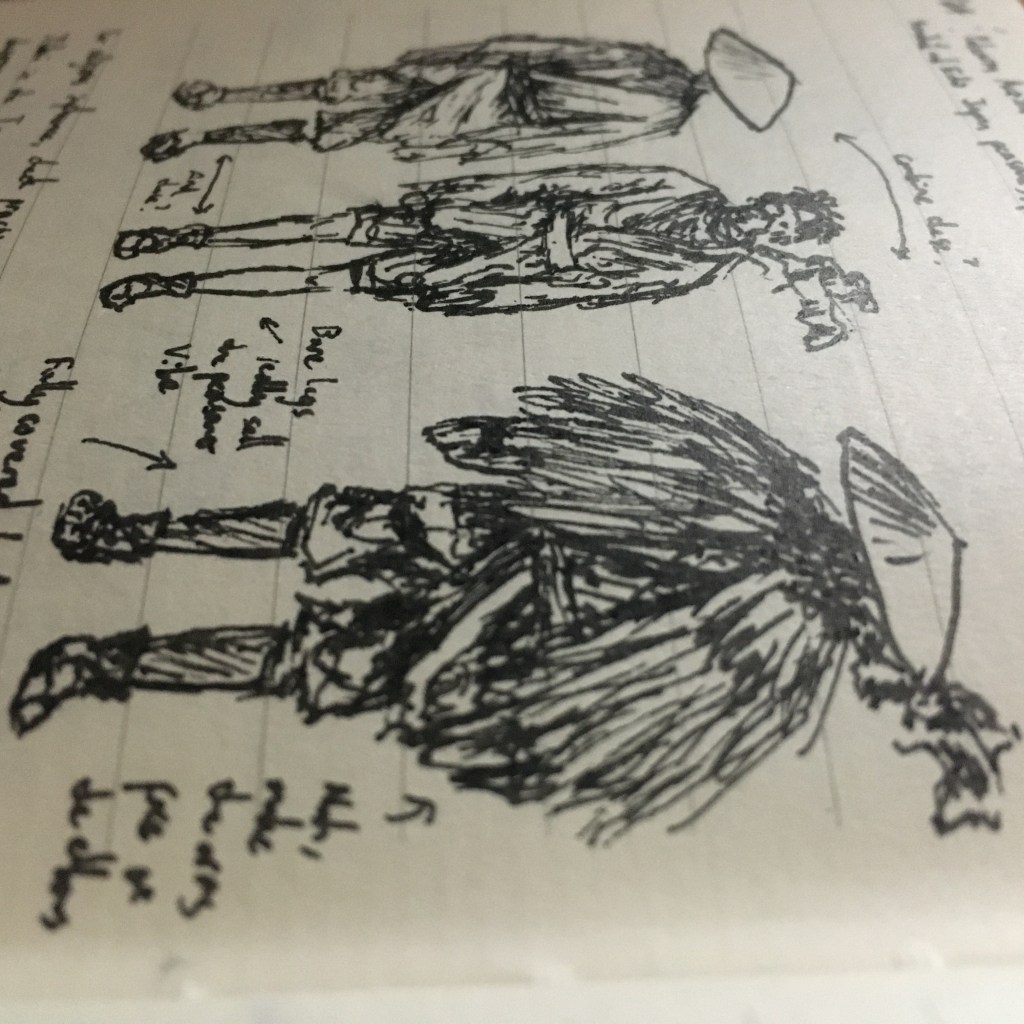 As soon as I’m ready to share any of the projects, I’ll make separate pages for them on this website. As has already happened, some ideas might be completely abandoned, although I do have at least some faith in those I’ve started documents for. Until then, here are the taglines for each of the current documents I have, as well as some sketches and doodles for some of them: